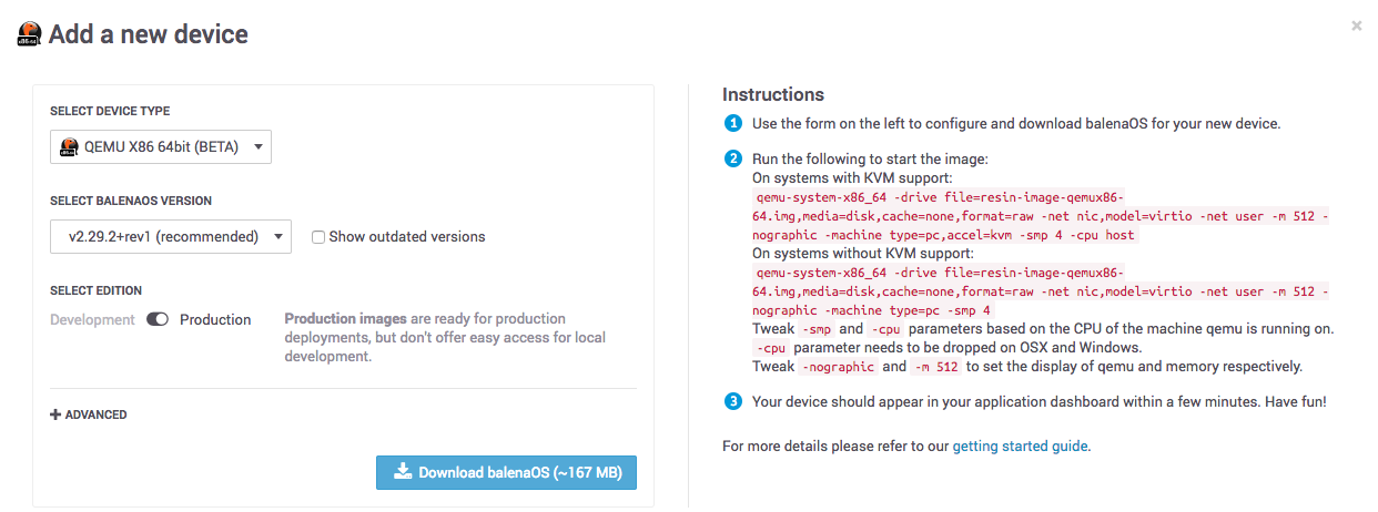 To add a device to a Balena application, we’ll need to download a BalenaOS image to run on the remote device. Please select the QEMU X86 64bit device type, the latest BalenaOS version, and the Production edition.