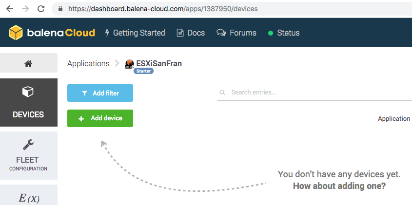 Balena add new device window