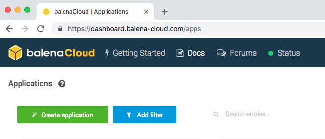 With a web browser, navigate to the Balena dashboard and create a new application by selecting the Create application button.