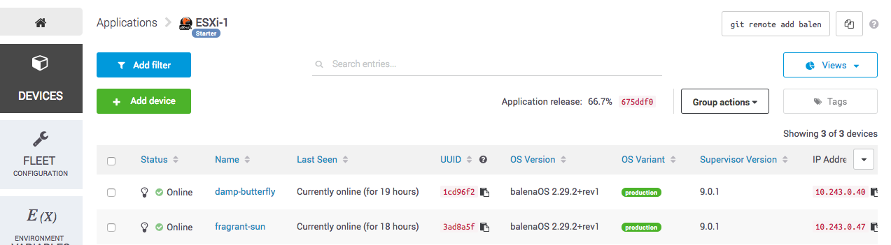 After powering on the FactoryTX VM, use a web browser and navigate to the Balena dashboard and check the application for a new device to appear.