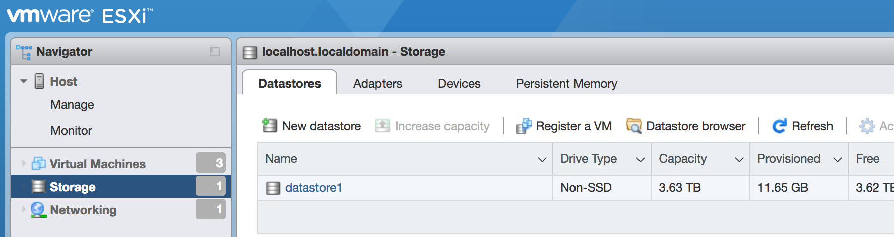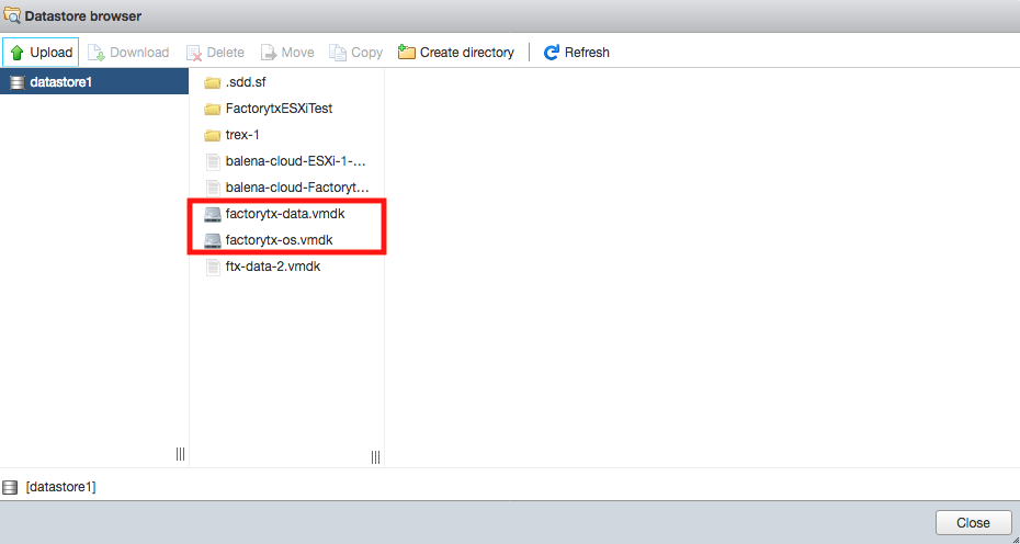 With our FactoryTX VM files (e.g. factorytx-os.vmdk and factorytx-data.vmdk files) stored on our local device, connect and log in to the ESXi server. From the sidebar, navigate to the datastore.
