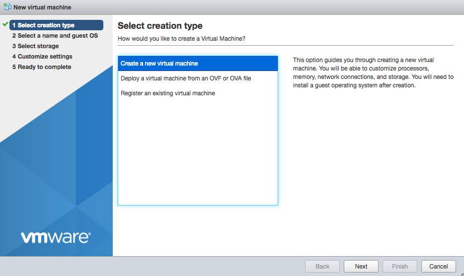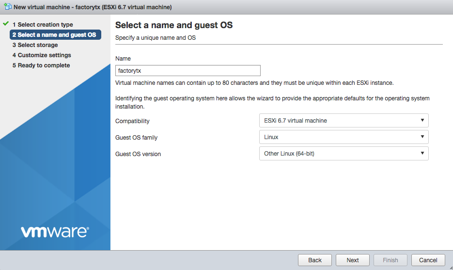 When prompted to select a name and guest OS for the virtual machine, select Linux for the OS family and Other Linux (64-bit) for the OS version.